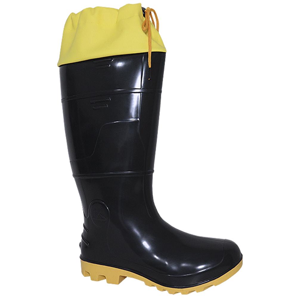 Calçado ocupacional, impermeável, confeccionado em PVC (Policloreto de Vinila), cano longo com polaina, na cor preta com solado na cor amarela, antiderrapante ideal para uso em ambiente úmidos e riscos de natureza leve.